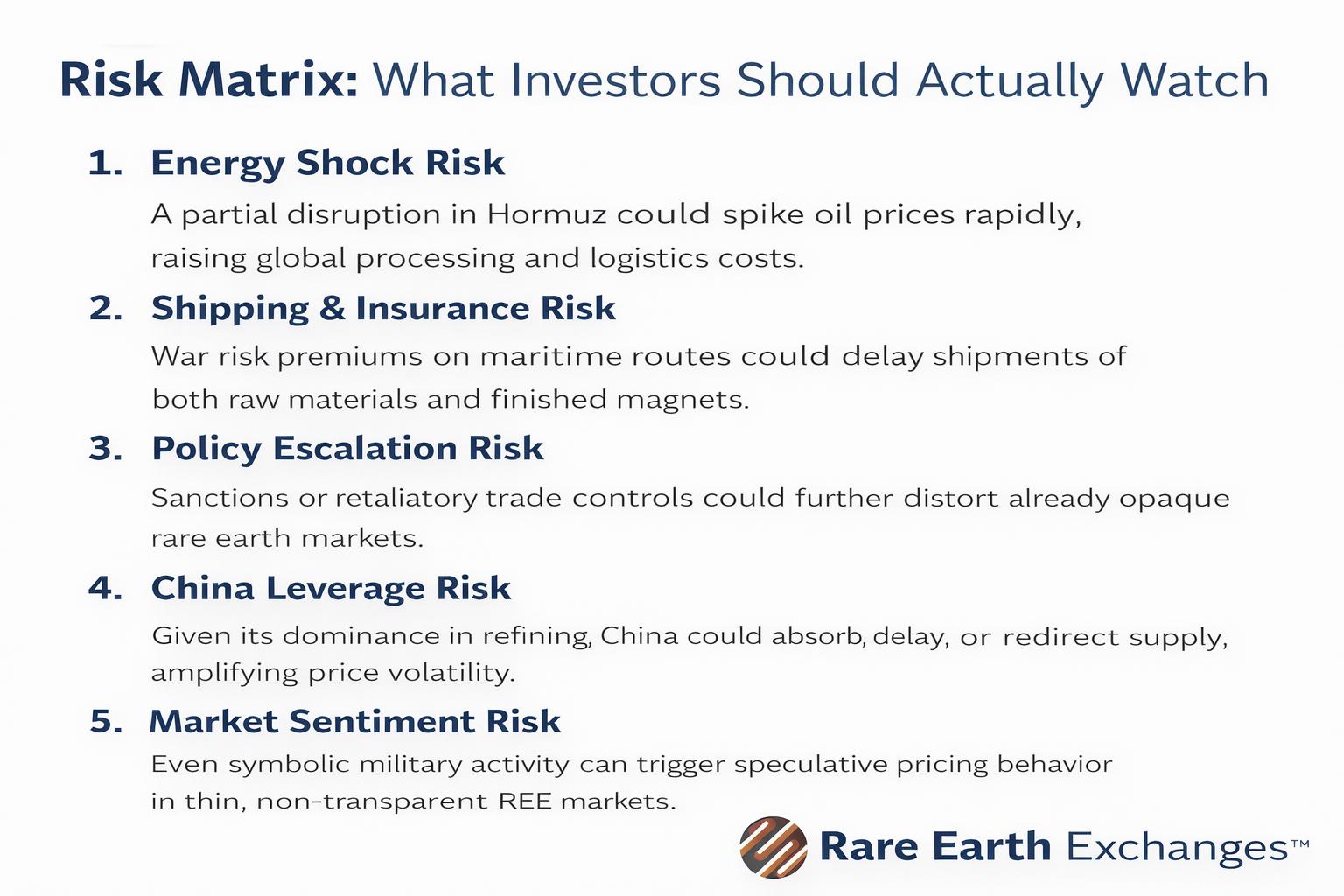 Bottom line: A disruption in Hormuz can propagate into rare earth pricing—even without a single mine being affected.