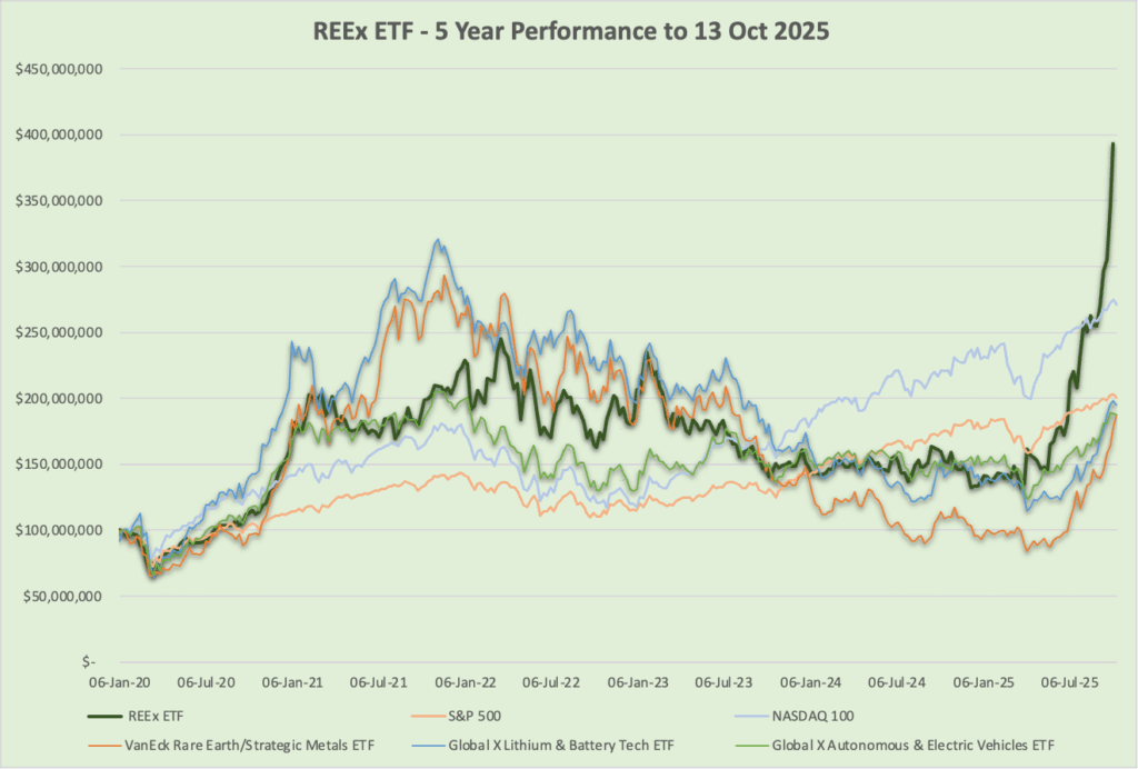 By comparison, the S&P 500 and NASDAQ 100 both showed more modest weekly movements, reflecting a cautious tone in broader equity markets. Even among targeted thematic peers, REEx stood out. The VanEck Rare Earth/Strategic Metals ETF (REMX) recorded a smaller gain, while Global X Lithium & Battery Tech (LIT) and Global X Autonomous & Electric Vehicles (DRIV) were mixed, showing how performance can diverge even among resources linked to the same long-term energy transition story.