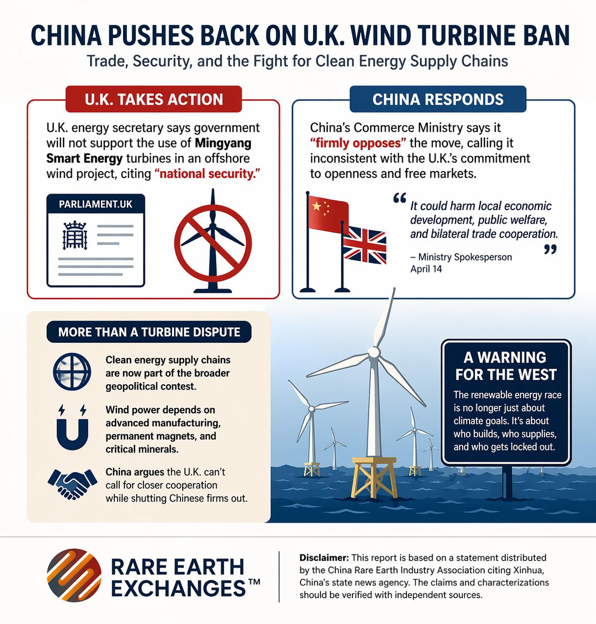 Chinaโs Commerce Ministry said on April 14 that it firmly opposes what it described as the U.K.โs decision to exclude Chinese products from British wind power projects on national security grounds. The immediate trigger was a statement by the U.K.โs energy secretary (opens in a new tab), posted on Parliamentโs website, saying the British government does not support the use of Mingyang Smart Energy (opens in a new tab) turbines in an offshore wind project in the U.K.