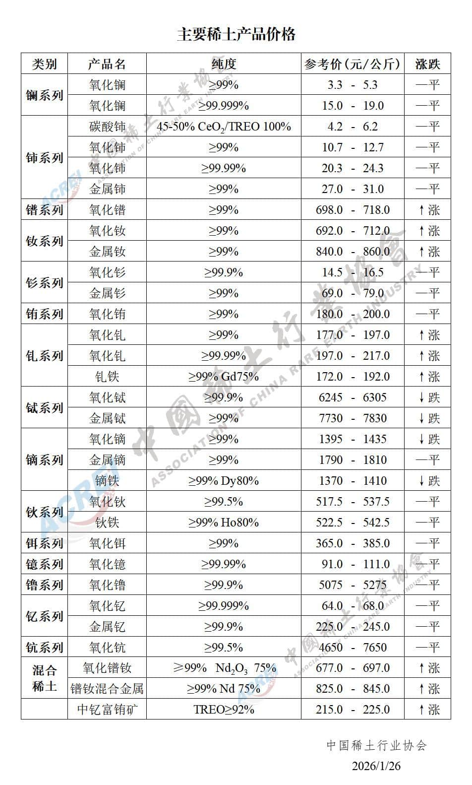 • Nd-rich alloy: ¥825–845/kg (≈ $115–117/kg)