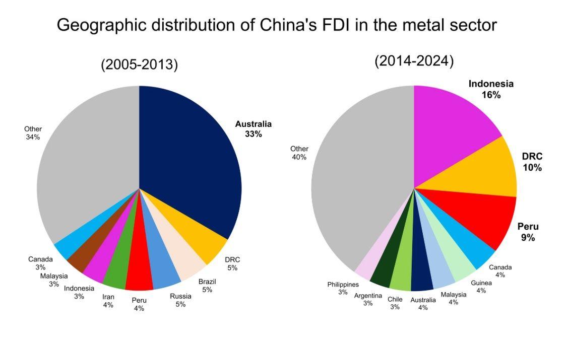 - Chinese FDI in metals shifted dramatically after 2014: Australia’s share dropped from 33% to 4%, while Indonesia, the DRC, and Peru saw surges targeting battery-critical minerals like nickel, cobalt, and lithium.
