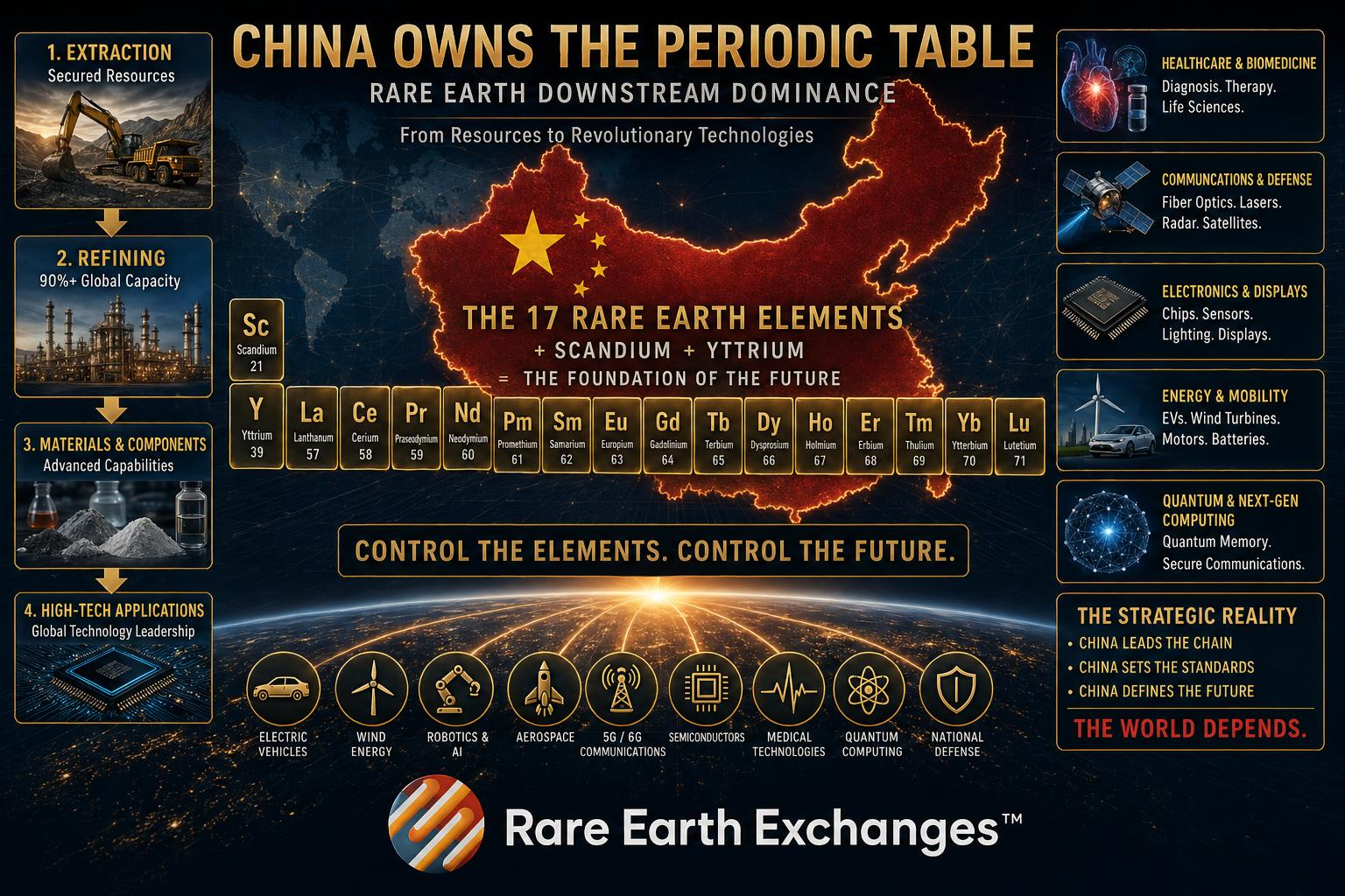 • China is executing a coordinated vertical integration strategy in rare earths—moving beyond extraction to dominate downstream applications in medicine, quantum computing, defense systems, and advanced electronics through breakthrough materials science.