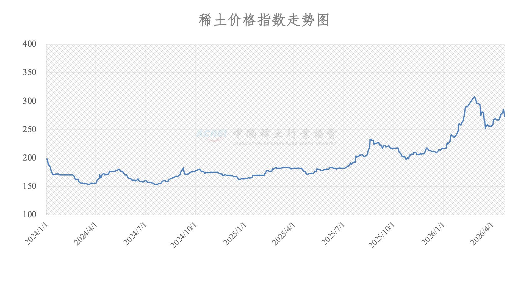 China’s rare earth price index stood at 272.8 on April 24, 2026, according to the China Rare Earth Industry Association. That is elevated by historical standards, using 2010 as the base year of 100, but it is not a straight-line surge. The chart shows the index climbing sharply into early 2026, peaking above 300, then pulling back before recovering into the high 270s. The correct read: China’s rare earth market remains tight and strategically important, but the latest data show a mixed, managed market—not a uniform price breakout.