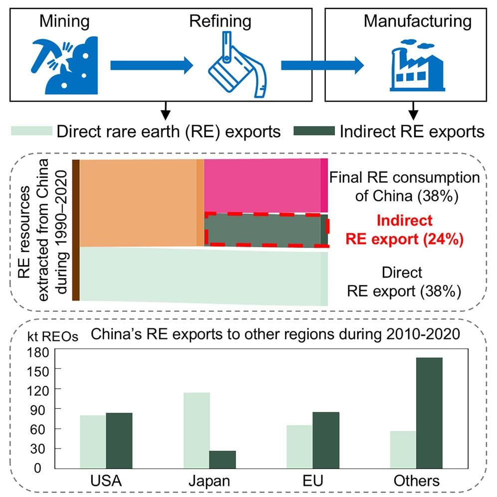 A new peer-reviewed study (opens in a new tab) led by Ling Shao, corresponding author at the China University of Geosciences and the Ministry of Natural Resources–affiliated Key Laboratory of Carrying Capacity Assessment for Resource and Environment, exposes a major blind spot in global rare earth (RE) strategy: a large share of China’s dominance never appears in customs data at all. Published in Cell Reports Sustainability, the study shows that from 1990–2020, over 60% of rare earths extracted in China were exported, and about 38% of those exports occurred indirectly, embedded in magnets, components, and manufactured goods that quietly sustain global consumption.