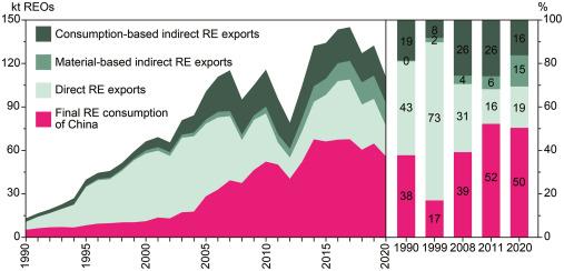 • Export scale: From 1990–2020, China exported over 60% of the rare earths it extracted; roughly 62% were direct exports and 38% were indirect, embedded in traded goods