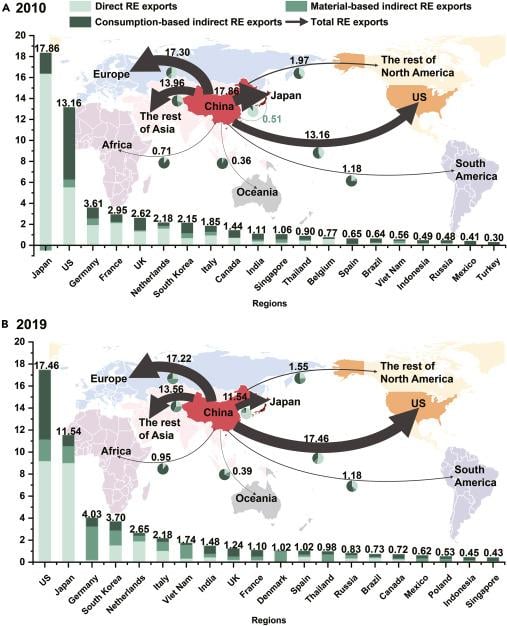 Direct and indirect RE exports from China to other regions in 2010 and 2019