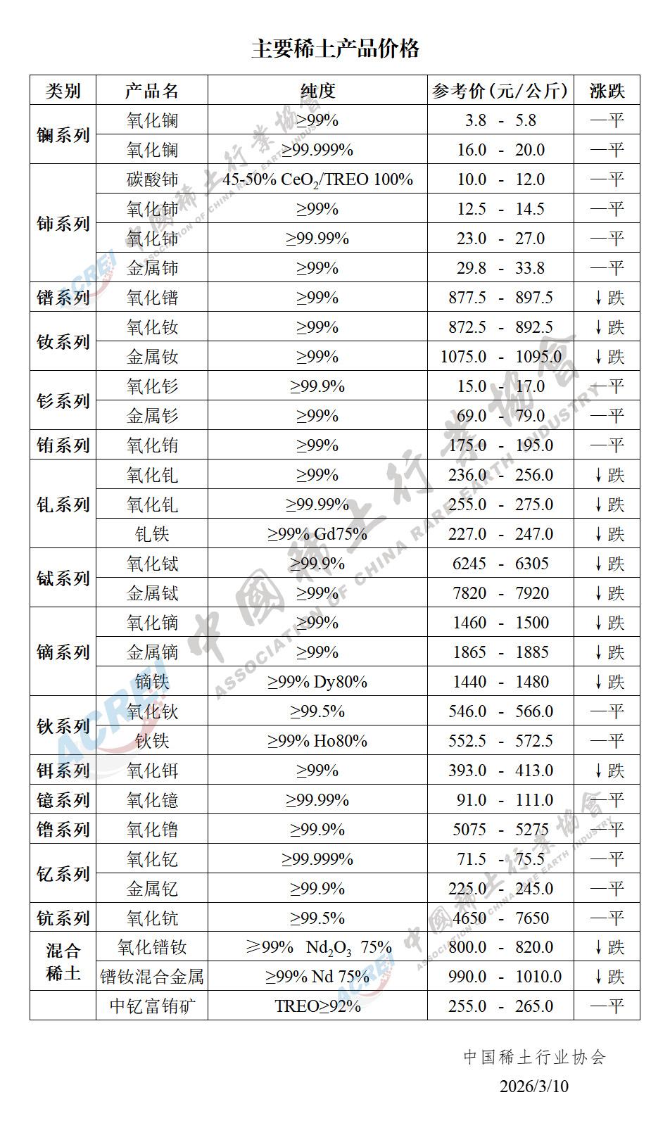 - China's Rare Earth Price Index fell 3.1% to 285.2 on March 10, with heavy rare earths like dysprosium and terbium leading the decline while light rare earths remained stable.