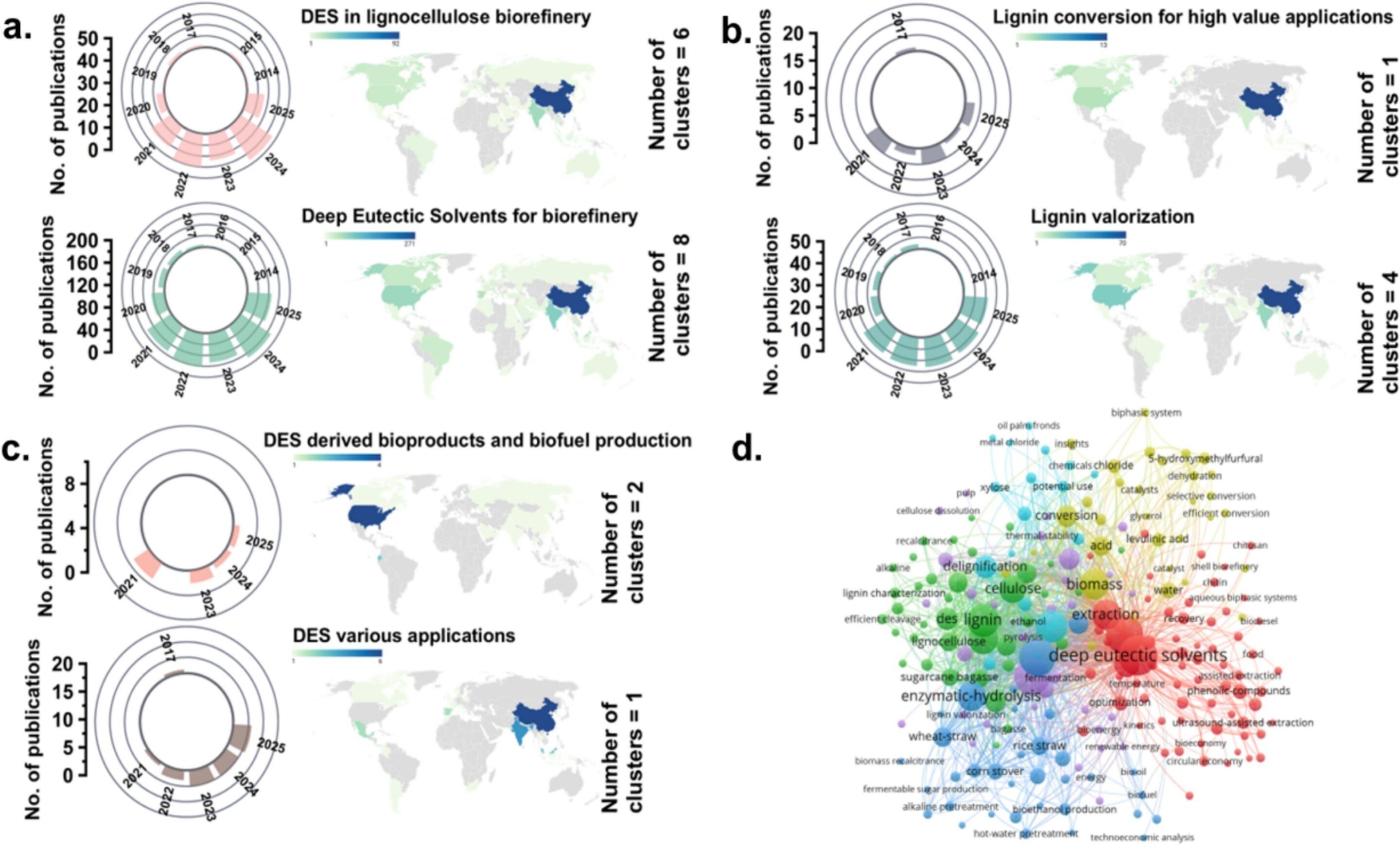 Overview of published literature on DES applications in biorefineries (2012–2025), showing publication trends (by year and country) and keyword network visualization (number of clusters included), illustrating: (a) DES in lignocellulose biorefinery and biorefinery applications. (b) Lignin conversion for high-value applications and lignin valorization. (c) DES-derived bioproducts, biofuel production, and related applications. (d) keyword network visualization of DES in biorefineries.