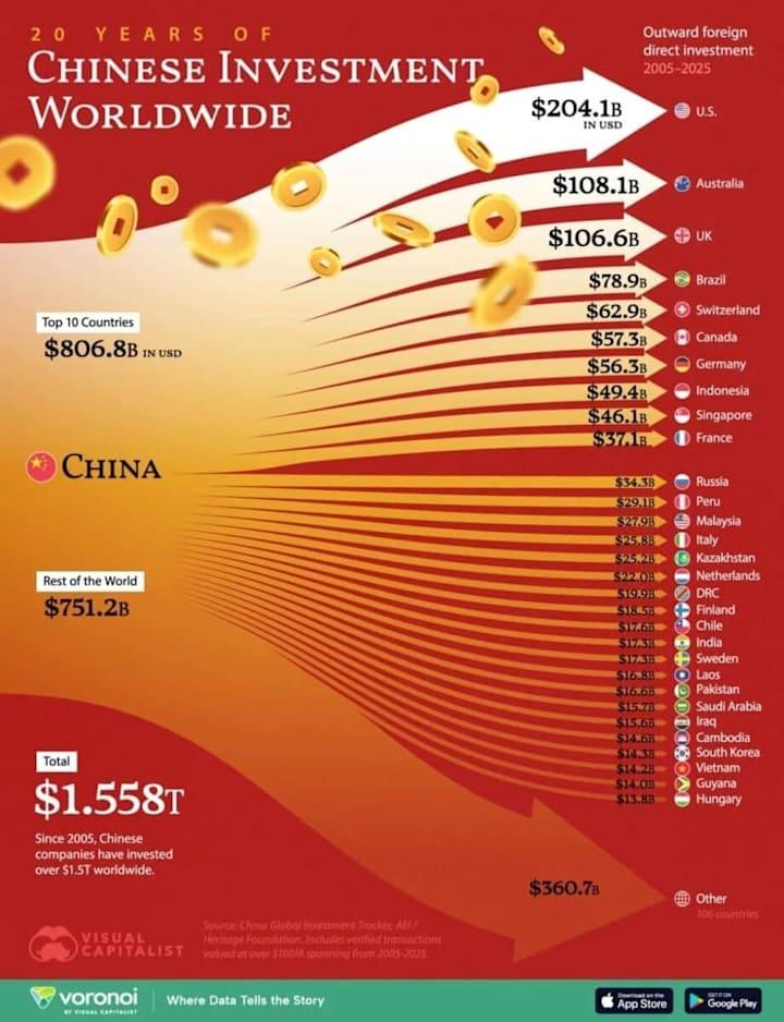 Over the past two decades, China deployed $1.558 trillion in outbound foreign direct investment (FDI) (Visual Capitalist; China Global Investment Tracker, AEI/Heritage Foundation). Of that, $806.8B flowed into the top 10 countries, while another $751.2B spread across the rest of the world, with over 100 additional countries capturing $360.7B. This is not random dispersion—it is structured global positioning.