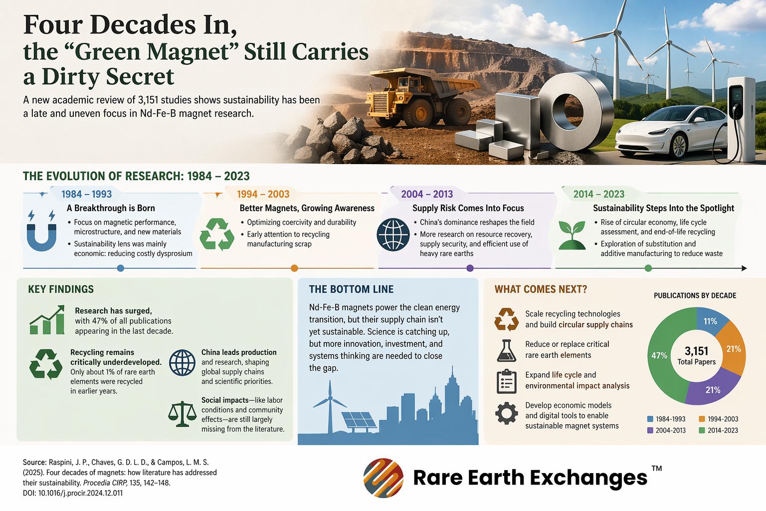 - A comprehensive review of 3,151 papers from 1984–2023 reveals that Nd-Fe-B magnet research has evolved from performance optimization to sustainability concerns, yet recycling rates remain at just 1% despite supply chain risks.
