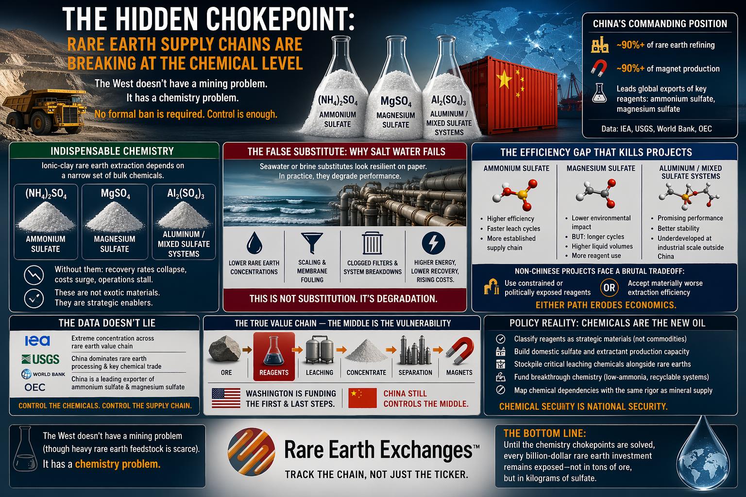 - China dominates not just rare earth mining but the critical reagent supply chainsโammonium sulfate, magnesium sulfate, and aluminum sulfate systemsโthat make extraction economically viable.
