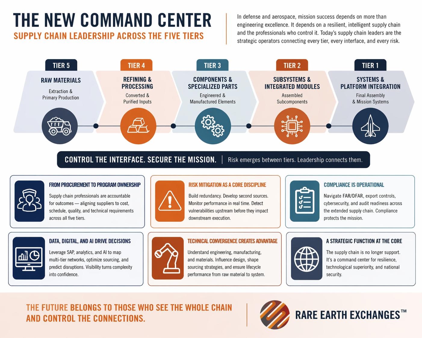 • Supply chain professionals are evolving from transactional procurement roles to strategic operators controlling interfaces across five tiers—from raw resource extraction to final system assembly.